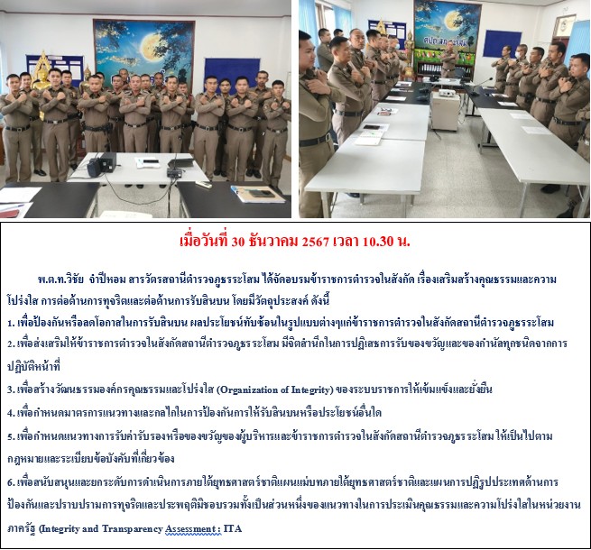 วันที่ 7 ก.พ. 2567 เวลา 15.30 น พล.ต.ท.จิรสันต์ แก้วแสงเอก นำข้าราชการตำรวจ ระดับ รอง ผบช. , ผบก. , รอง ผบก. และ หน.สภ. ทุกนาย ในสังกัด ร่วมประกาศนโยบายการต่อต้านการรับสินบน ณ ห้องประชุม อมรวิวัฒน์ ตำรวจภูธรภาค 1 โดย พ.ต.อ.สุรัตน์ เป้าทอง ผกก.สภ.เมืองชัยนาท ร่วมกิจกรรม ในที่ประชุมบริหาร ภ.1